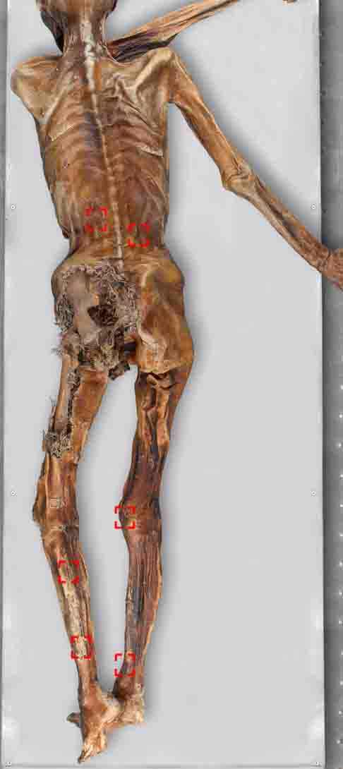 La curiosidad es que la momia Ötzi tiene más de 50 tatuajes repartidos por el cuerpo y son un auténtico enigma ya que en cada tatuaje se encuentra un algún tipo de lesión según las radiografías. Normalmente en el resto de momias los tatuajes representan una etapa importante en la vida de ese hombre, o están relacionados con la clase y el poder o con algún tratamiento curativo.